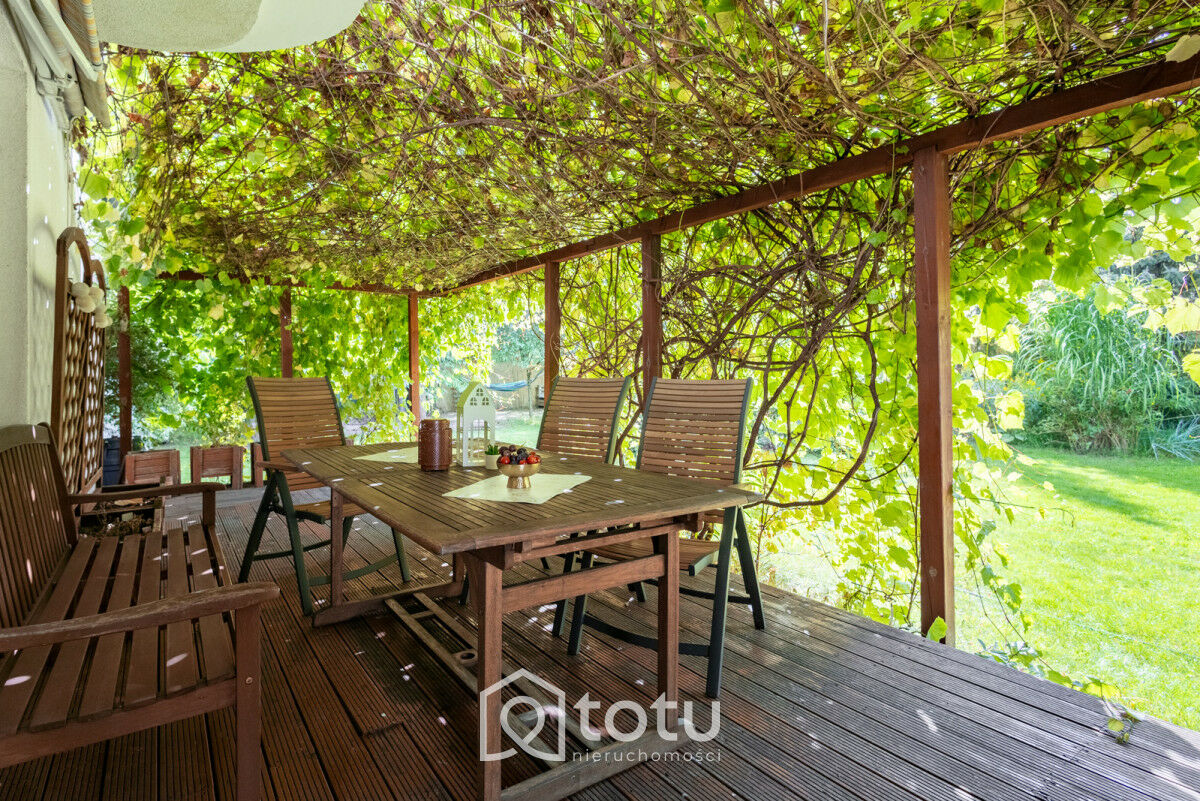 zadaszony i POROŚNIĘTY WINOROŚLĄ TARAS, zapewniający odpoczynek w urokliwym zacienieniu z widokiem na ogród;
