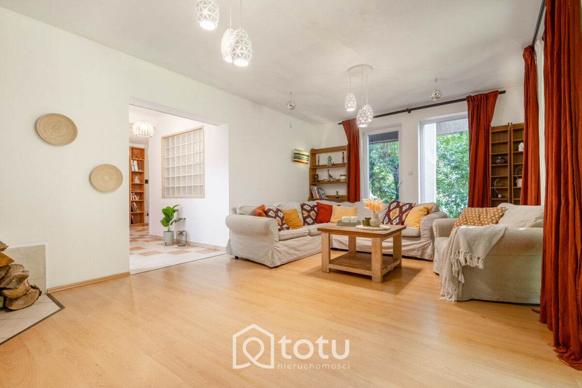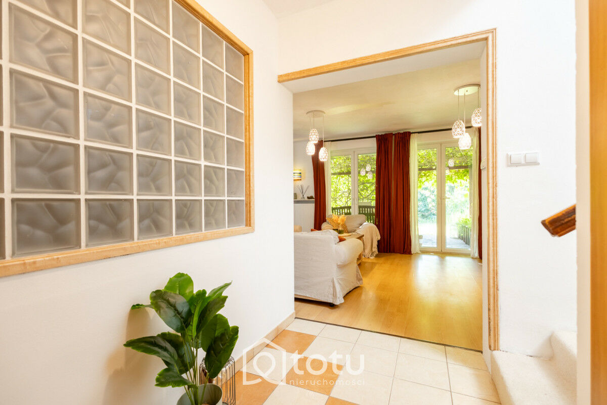 Teren zielony stanowi NIEPOWTARZALNIE ZAARANŻOWANY OGRÓD - bez nadęcia, lecz pomysłowy, intymnie schowany wśród gęsto rozrośniętych drzew i krzewów, a jednocześnie z dużą otwartą przestrzenią do zabaw i rekreacji.